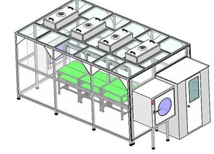 百級潔凈棚-無塵工作站一般以工業(yè)鋁材(不銹鋼方通、噴塑方通)做框架,采用風(fēng)機(jī)濾網(wǎng)機(jī)組FFU送風(fēng),四周采用防靜電垂簾,頂部鋪蓋密縫盲板,形成一個(gè)密縫區(qū),內(nèi)部凈化級別可達(dá)100---10萬級;特別適用于車間內(nèi)局部對潔凈度要求高的區(qū)域,如流水線作業(yè)區(qū)的高精確度產(chǎn)品組裝區(qū)。