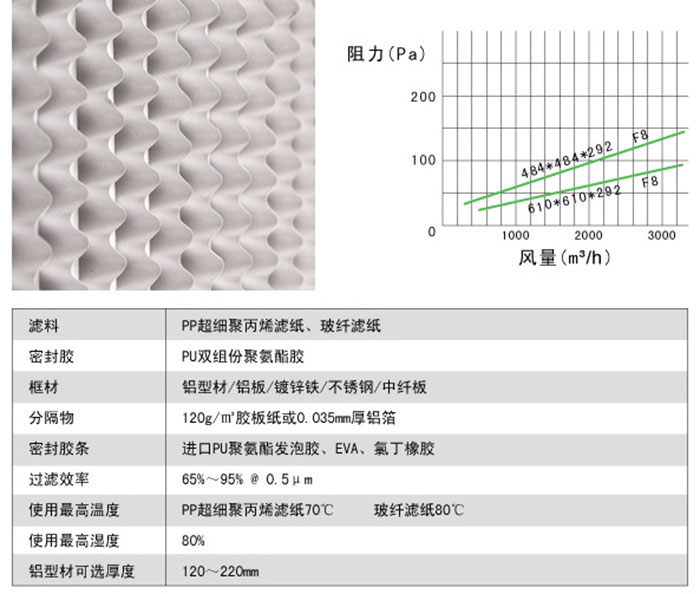 有隔板中效過濾器濾料為抗?jié)裥?00%人造纖維濾材制成,有隔板中效過濾器濾網(wǎng)制成V字型,給予氣流提供更大過濾面積,有隔板中效過濾器采用特殊的工藝使濾網(wǎng)間保持一定距離,過濾面積增大,有隔板中效過濾器容塵量較高。F-S有隔板中效過濾器濾料可清洗,反復(fù)使用,節(jié)約經(jīng)濟(jì)成本。